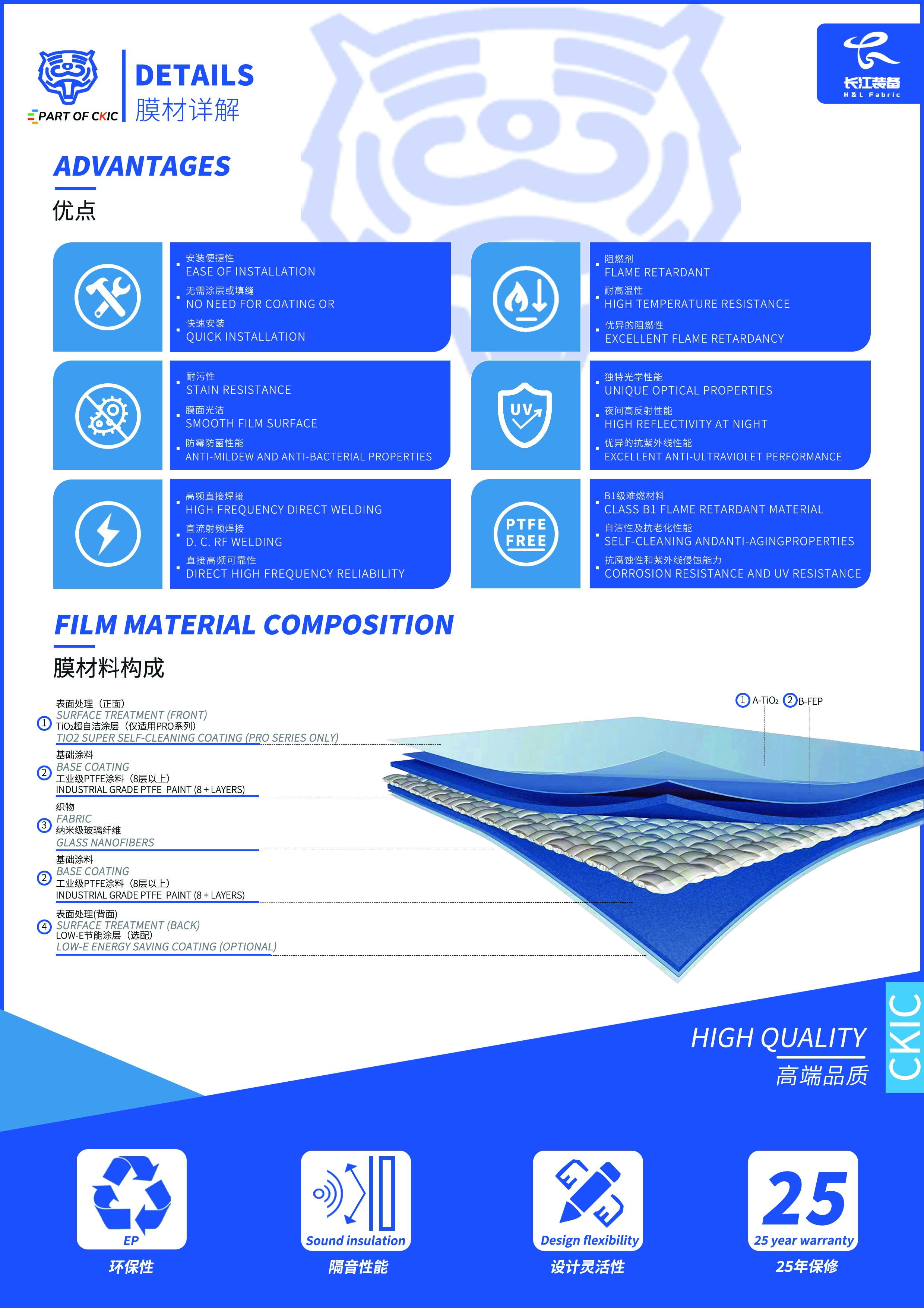 PTFE膜材基布是超細玻璃纖維織物,表面涂以聚四氟乙烯樹脂而成的合成材料,顏色單一僅為乳白色,其優(yōu)點就是耐腐蝕、防水、耐菌、耐高溫、抗紫外線、自潔能力強、難燃阻" />