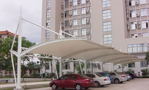張拉膜車棚材料選用了進(jìn)口結(jié)構(gòu)建筑材料。車棚骨架,表面處理采用進(jìn)口船用底漆,炳烯酸聚氨酯面漆。
