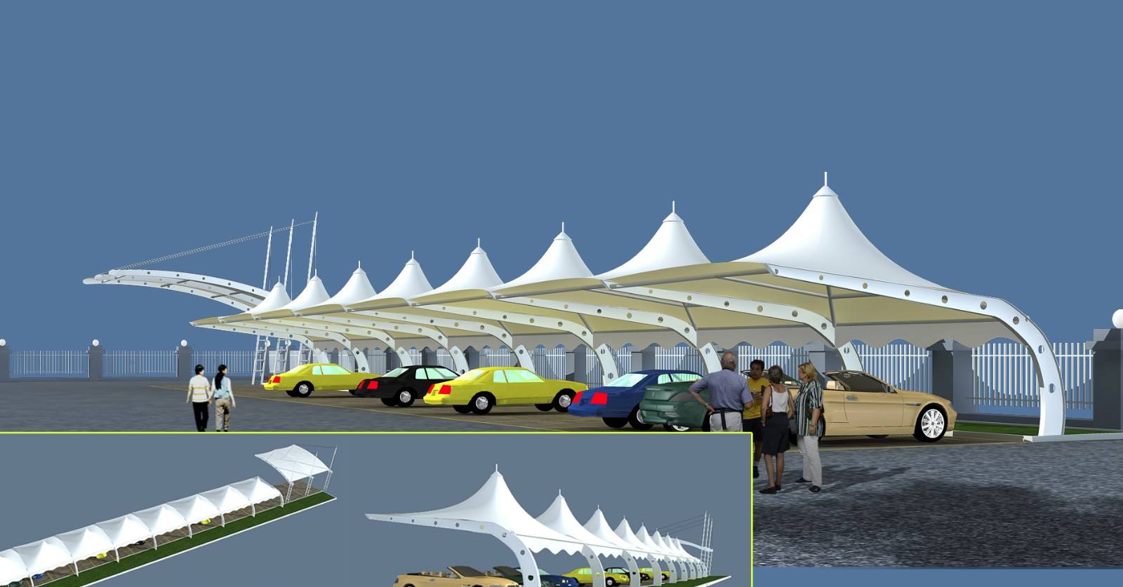 景觀張拉膜結(jié)構(gòu)以其輕盈飄逸的造型、柔美并帶有力量的曲線和大跨度和大空間的鮮明個(gè)性和標(biāo)識(shí)性,并與園林景觀溶為一體。創(chuàng)造出讓人們盡情享受的快樂空間。充分展示了結(jié)構(gòu)構(gòu)件清晰受力的藝術(shù)之美,它巧妙的整合周圍的環(huán)境,給人們一種高貴典雅、浪漫溫馨之感。另外由于張拉膜材料本身特有的顯色性,在夜間彩燈的映射下能形成絢麗繽紛的景觀。不僅為人們提供遮陽避雨的空間。同時(shí),更由于這種生動(dòng)活潑的造型能給人們帶來時(shí)尚、輕松的休閑感受,所以廣受歡迎。