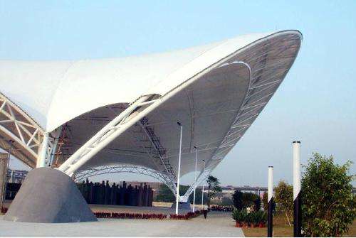 膜結(jié)構(gòu)其造型自由、輕巧、柔美,充滿力量感、阻燃、制作簡易、安裝快捷、節(jié)能、使用安全等優(yōu)勢,讓各種藝術(shù)性的膜結(jié)構(gòu)造型建筑呈現(xiàn)在人們眼前。從材料上來看,PVDF膜材色彩豐富彩色建筑世界更加絢爛多姿;PTFE膜材越用越白度過出淤泥而不染的潔凈的一生。